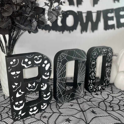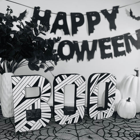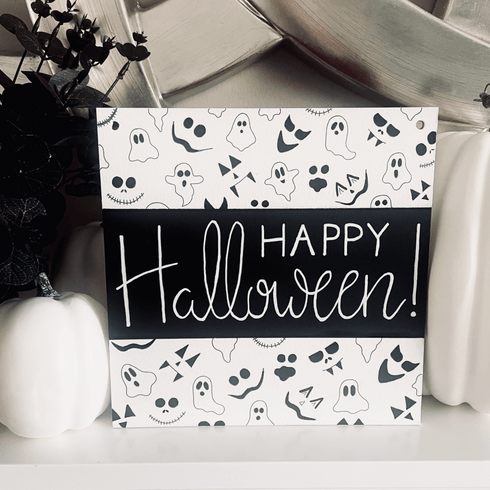 This classic monochrome square sign features playful pumpkins, ghosts and festive illustrations, creating a timeless look that’s both stylish and spooky.