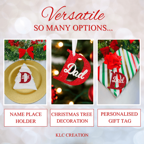 Put a twinkle in Dad's eye this year with our Beautiful Red Glitter Dad Christmas Decoration. Place on your Christmas tree to add the perfect amount of love this Holiday season. Our Dad Name Ornaments can also be used as extra special gift name tags, Add to your Christmas Table as place setting name tags or these name stunning stocking name tags that can be re-used year after year.